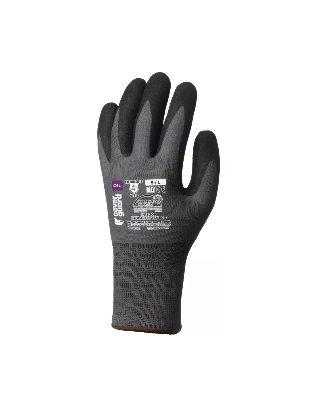 El guante Eurolite 1NISG de Coverguard es un equipo de protección individual de categoría II diseñado específicamente para el mantenimiento y trabajos de precisión en entornos aceitosos y grasos. Su estructura está compuesta por un soporte de punto gris sin costuras de poliamida y elastano, calibre 15, que ofrece un ajuste ergonómico con sensación de segunda piel para un confort excelente. El guante se distingue por un doble recubrimiento en la palma: una base de nitrilo liso negro combinada con un acabado efecto grano o «sandy», que garantiza un agarre excepcional incluso en presencia de aceites, hidrocarburos o grasas. Completado con un puño elástico de punto, el producto está certificado Oeko-Tex Standard 100 para garantizar la ausencia de sustancias nocivas y seguridad al contacto con la piel. Este modelo cumple con las normativas EN420:2003 + A1:2009 y EN388:2016 + A1:2018 con niveles de protección mecánica 4.1.3.1.X, siendo ideal para la industria ligera, la mecánica, el ensamblaje de pequeñas piezas, el trabajo de láminas y el sector energético.