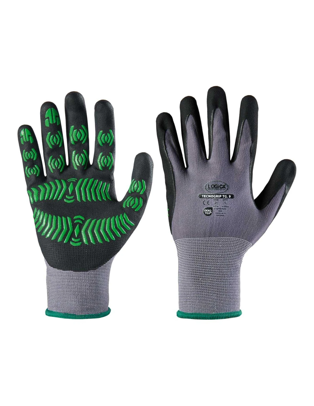 12 pares de guantes de trabajo anticorte Tecnogrip Logica con hilo continuo de nylon y spandex recubrimiento en nitrilo superfino en la palma palma con insertos verdes pulgar índice y medio compatibles con pantalla táctil dorso ventilado buena resistencia a la abrasión con puño elástico. Guante transpirable y elástico con galga 15. Normativas: EN 388 EN 407.