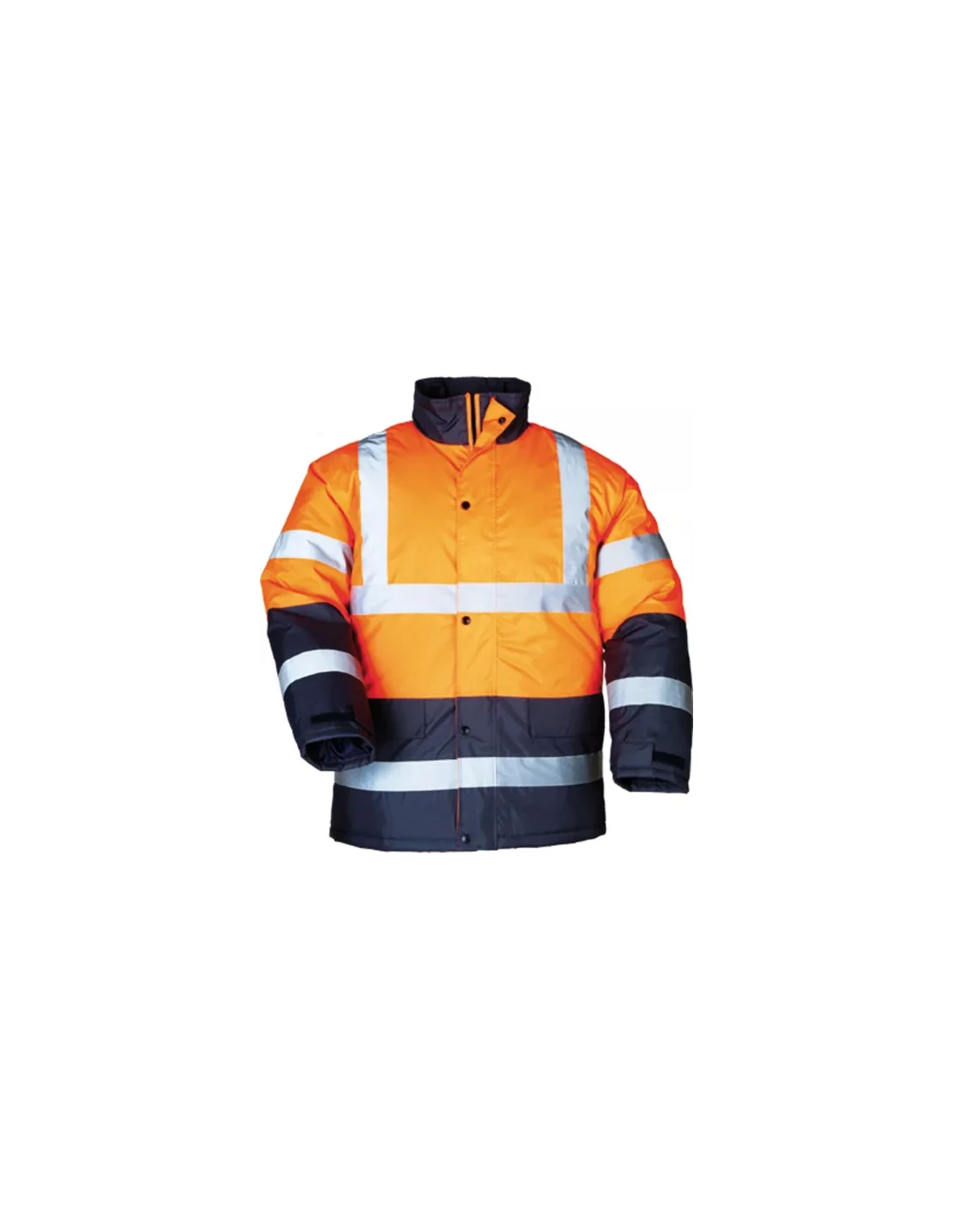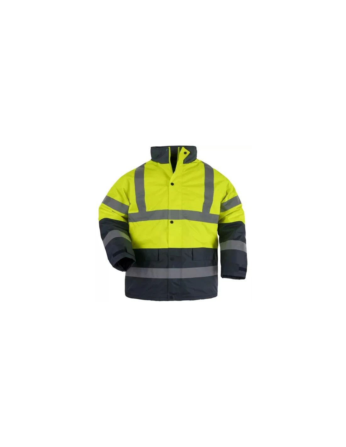 El parka ROADWAY modelo 7ROAO es una prenda certificada de alta visibilidad clase 3, ideal para la protección profesional en entornos fríos y de riesgo. Fabricado en resistente tejido Oxford 100 % poliéster recubierto de poliuretano 300D, garantiza un excelente aislamiento térmico y una óptima impermeabilidad gracias a las costuras termoselladas y al cálido acolchado interior. El diseño funcional incluye inserciones oscuras en color azul marino, ubicadas estratégicamente en el cuello, el bajo y los puños para disimular la suciedad en las zonas más expuestas, mientras que la visibilidad está asegurada por bandas retrorreflectantes cosidas en hombros, cintura y mangas. La estructura incorpora una capucha fija ajustable integrada en el cuello alto, un cierre central con cremallera protegida por solapa con botones a presión y puños ajustables mediante velcro para un ajuste óptimo. En cuanto al almacenamiento, el parka dispone de dos bolsillos inferiores con velcro, un bolsillo Napoleón protegido y un bolsillo interior aplicado, además de una apertura específica que facilita la personalización corporativa. Probado para resistir hasta 20 ciclos de lavado, el artículo cumple con las normativas EN342:2017 y EN ISO 20471:2013, consolidándose como un equipo de protección individual de categoría II, seguro y duradero.