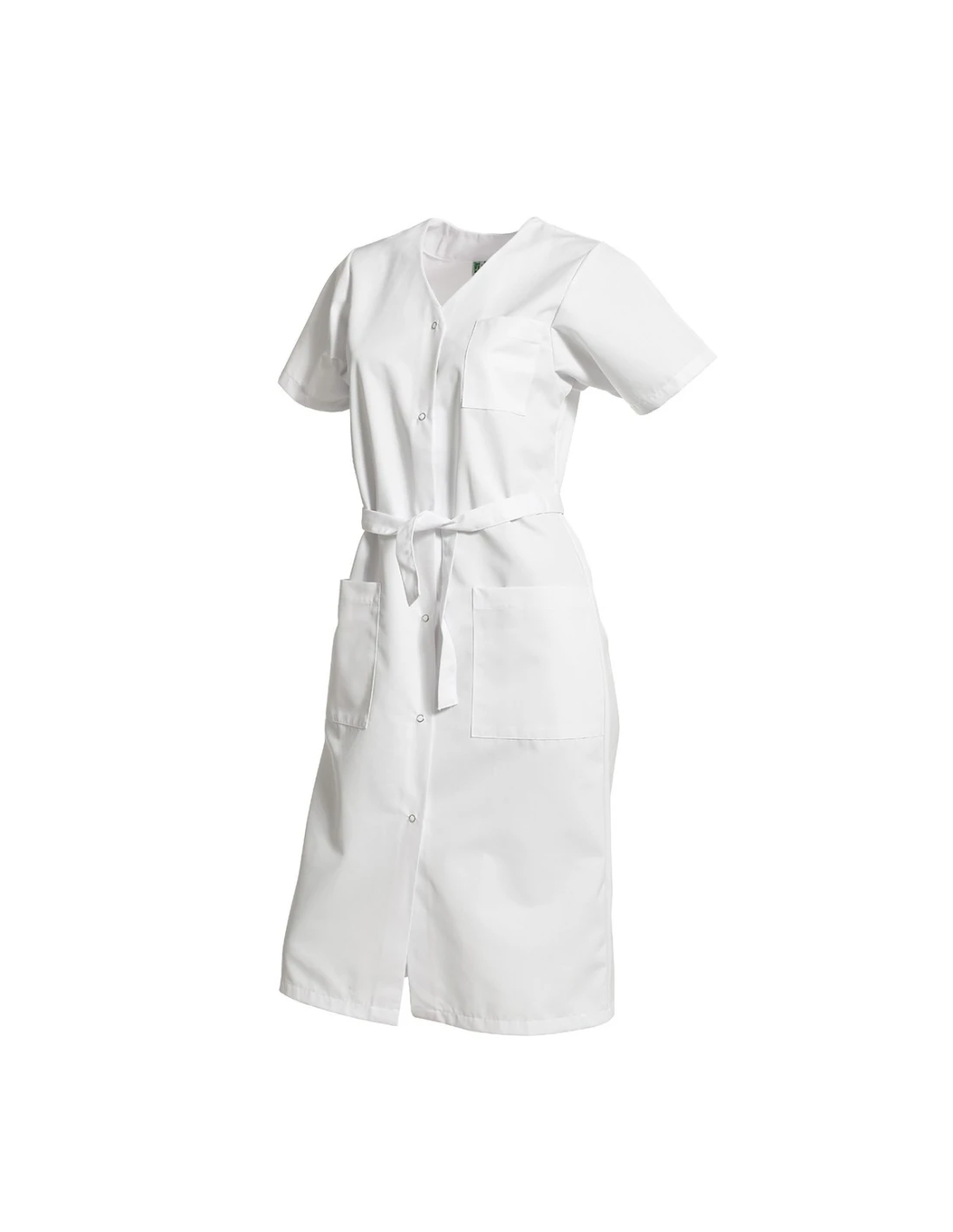 Bata para mujer elegante y funcional, con cuello sastre y ajuste impecable. Con mangas largas, cierre frontal con botones a presión, un bolsillo en el pecho y dos bolsillos bajos. Longitud 110 cm, ideal para uso profesional y diario.