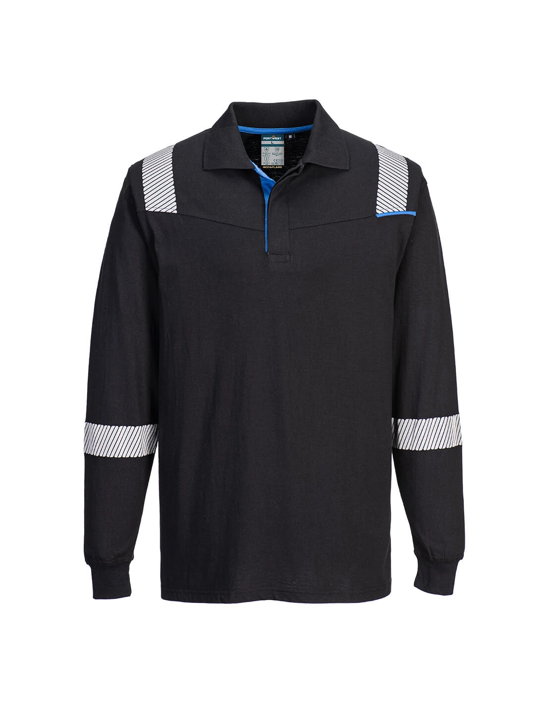 Sudadera Ignífuga de Portwest, ideal para trabajadores expuestos a calor de contacto, convectivo y radiante, gracias a sus cualidades ignífugas, antiestáticas, tejido clasificado 40+ UPF para bloquear el 98% de los rayos UV, tapeta de 3 botones, dobladillo y puños acanalados. CE-CAT III