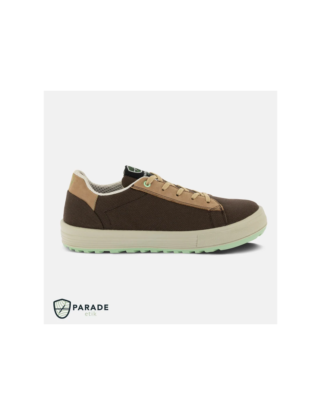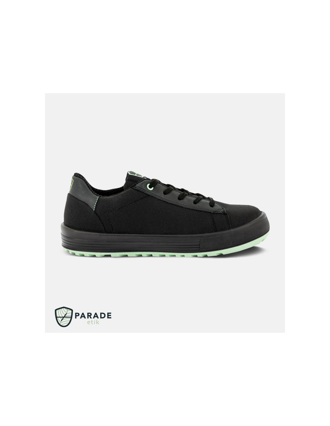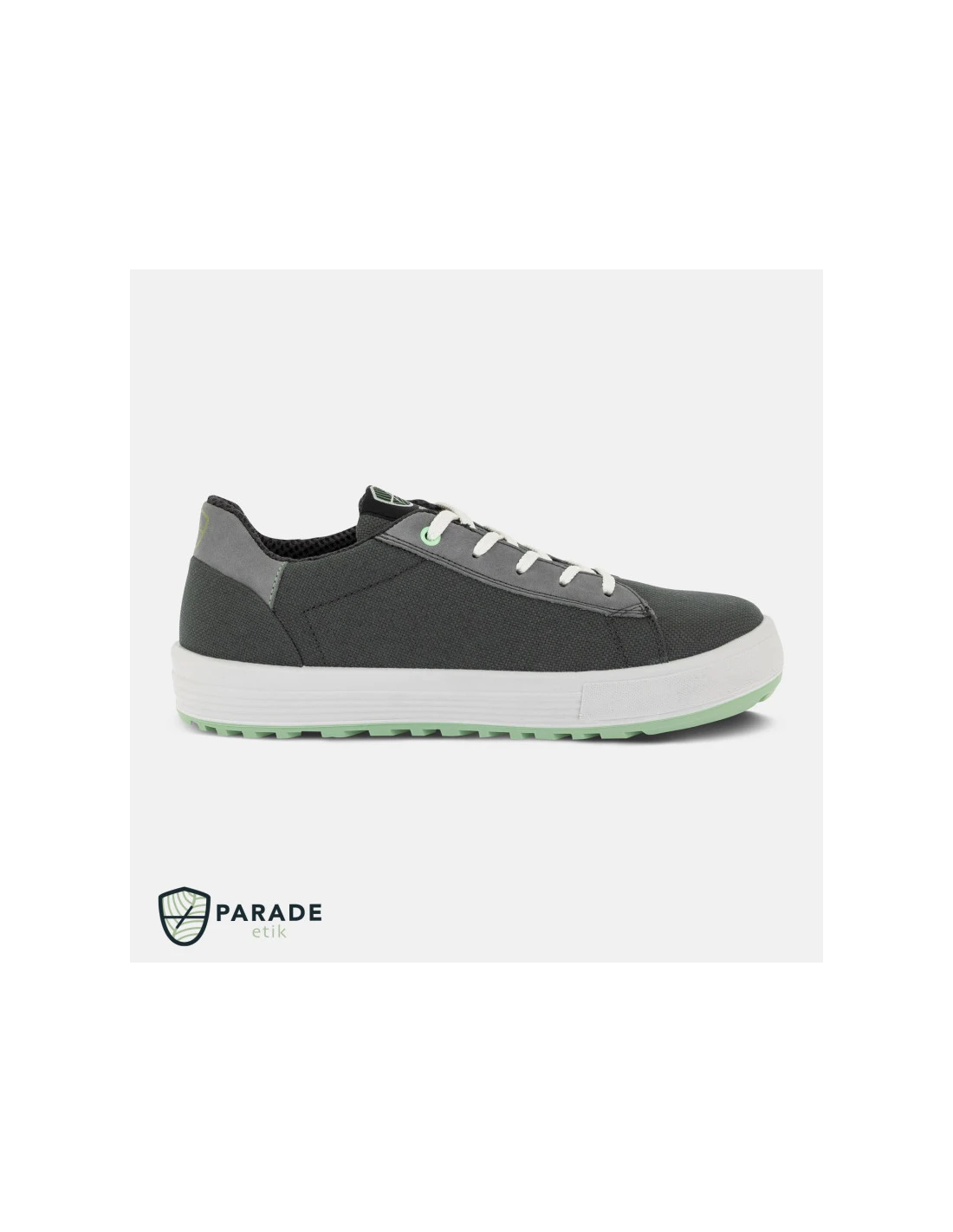 Zapatos de seguridad bajos de la marca Parade con empeine de lona con inserciones de cuero puntera de acero y plantilla antiperforación no metálica suela de poliuretano de doble densidad plantilla interior de espuma EVA extraíble. Normativa S1P SRC.